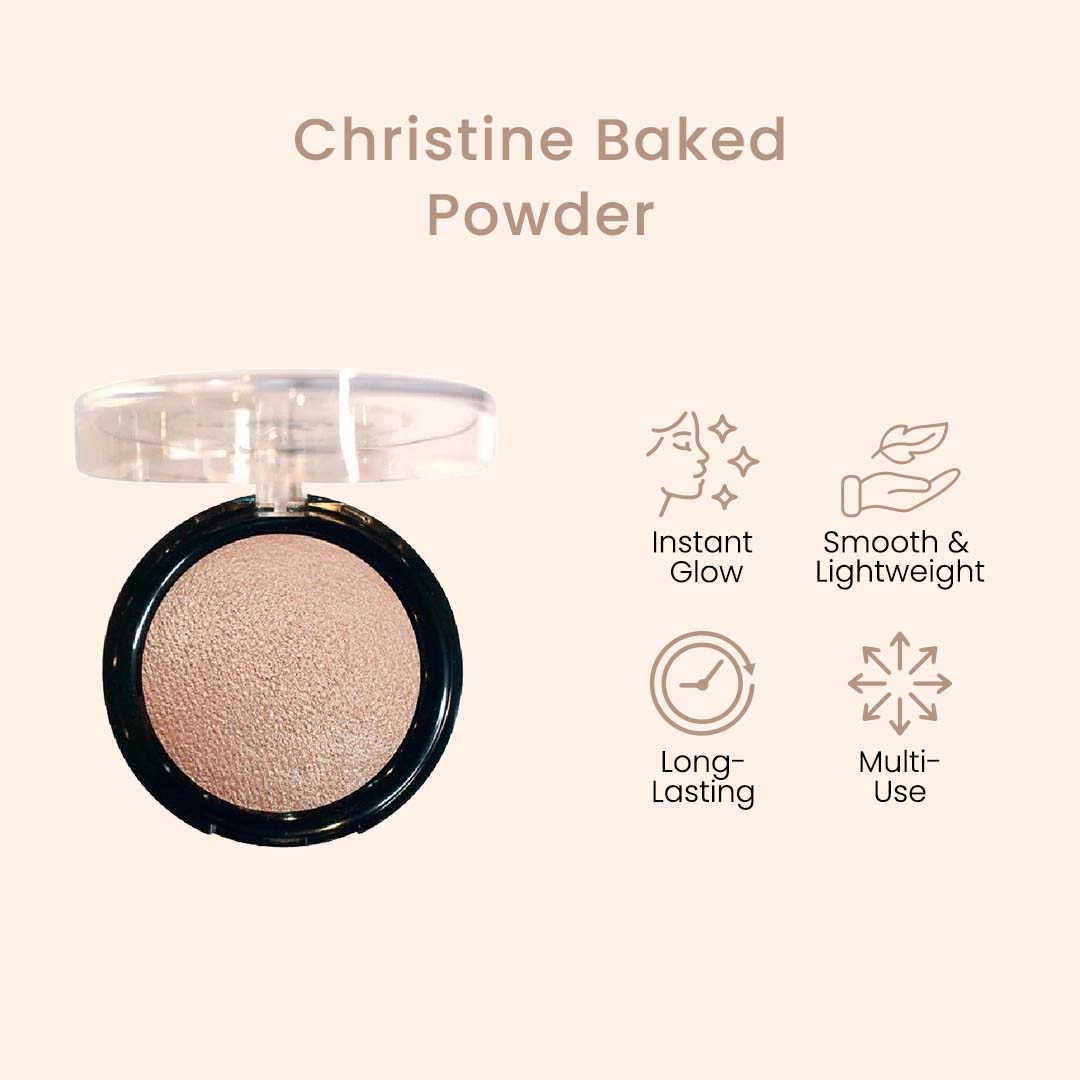 Give your makeup the star treatment with Christine Baked Powder. This ultra-fine, weightless powder provides a soft, glimmery finish without looking cakey or flat. The super-blendable formula melts into skin for a smooth, polished look that lasts all day. With light-reflecting pigments and skin-loving ingredients, Christine Baked Powder delivers a healthy glow and complete coverage in one simple step. Choose from a range of luminous shades to create a custom glow or set your makeup in place.
